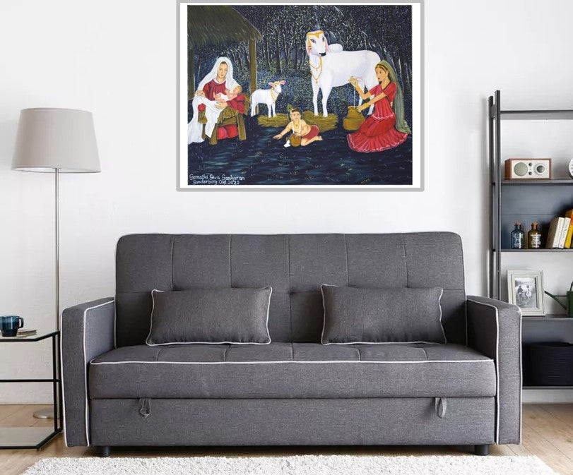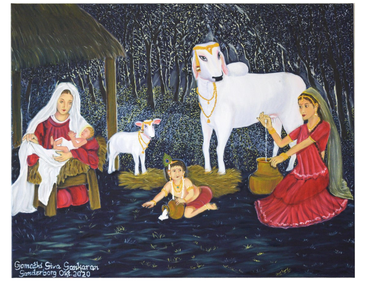 Throughout the life of Christ and Krishna one can find many similarities. This painting focuses on their childhood that touches on the similarity of their lifestyle and thereby celebrates diversity. Both Krishna and Christ were of a royal decency and are believed to be the incarnations of God. Yet both spent their childhoods as ordinary children. Furthermore, this painting highlights the strong women who had played important roles in the lives of these godmen.