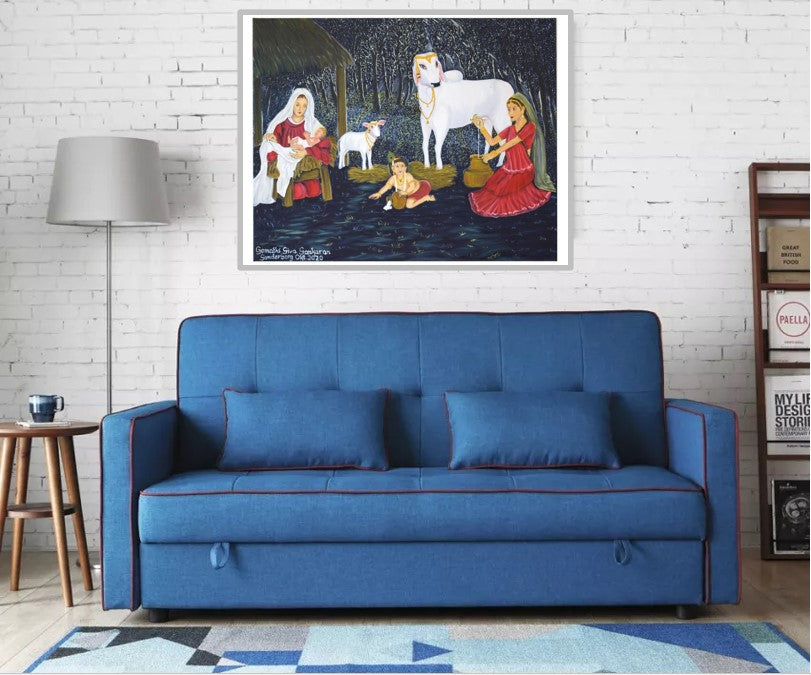 Celebrate diversity series - By love we stand together - This oil on canvas 80 x 100 cm shows baby Christ with mother Mary from Christianity and Krishna avatar (baby Krishna) with mother Yashoda from Hindu mythology. Surrounded by the forest and the cattle and enjoying the early morning sunlight creeping through the forest, both mothers and their children show the beauty in simplicity and love.