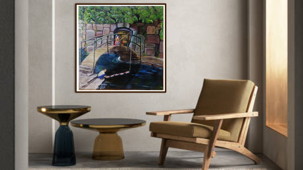 The artist imagines the children playing in the bridge using the waterway to sail their paper boats. The use of fishing rods to steer the paper boats depicts the naughty or creative approach that children try or play with.