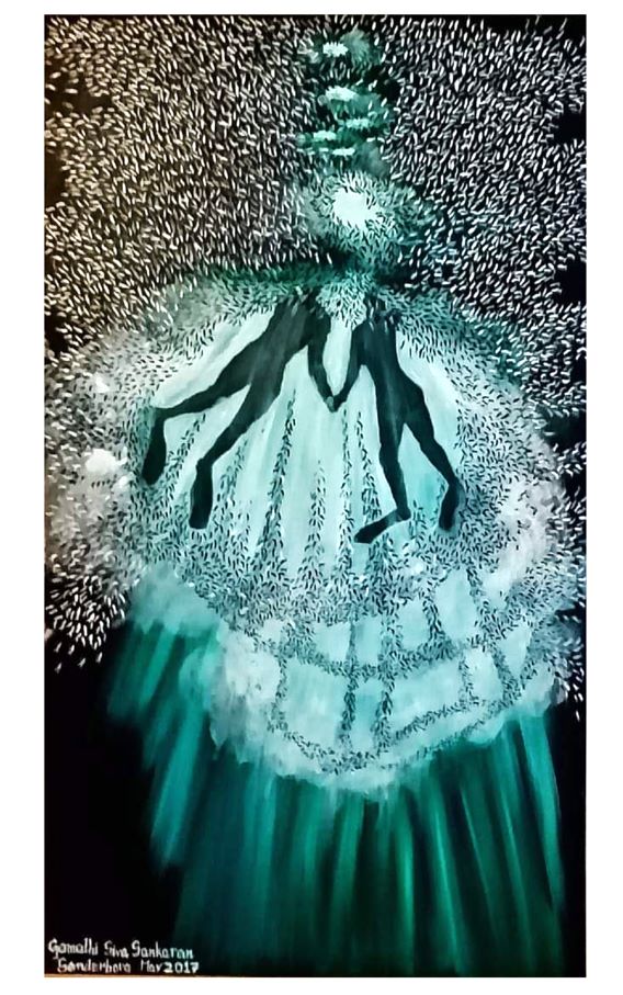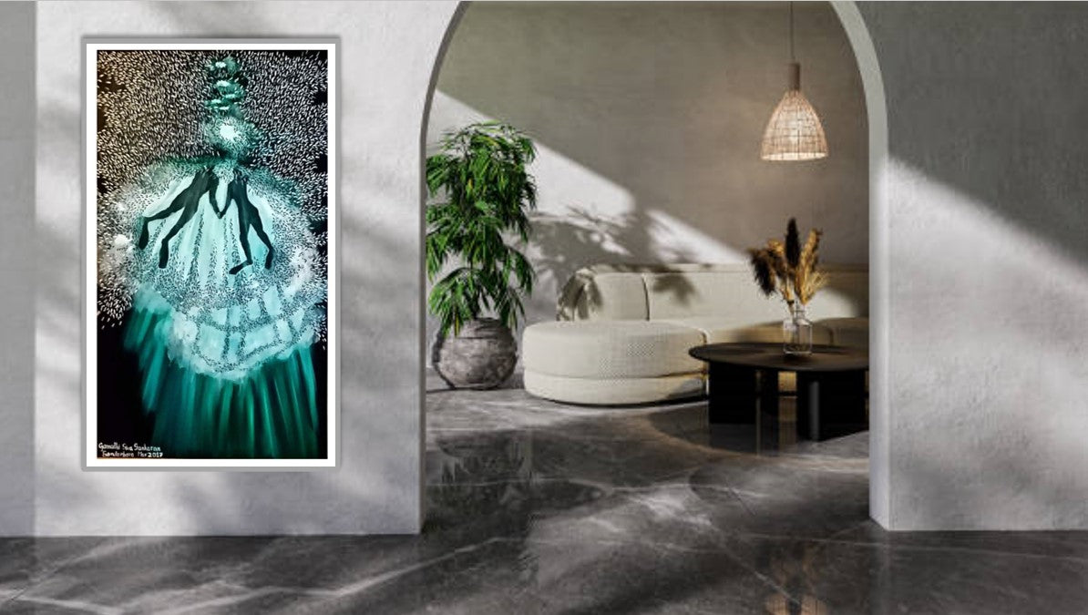 The artist imagines these divers working together and moving towards the light. The school of sardines engulfs them as they break their way through the water towards the light that may be coming from their boat